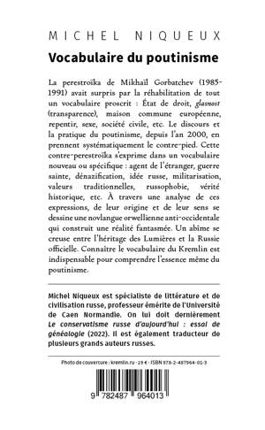 La perestroïka de Mikhaïl Gorbatchev (1985- 1991) avait surpris par la réhabilitation de tout un vocabulaire proscrit : État de droit, glasnost (transparence), maison commune européenne, repentir, sexe, société civile, etc. Le discours et la pratique du poutinisme, depuis l’an 2000, en prennent systématiquement le contre-pied. Cette contre-perestroïka s’exprime dans un vocabulaire nouveau ou spécifique : agent de l’étranger, guerre sainte, dénazification, idée russe, militarisation, valeurs traditionnelles, russophobie, vérité historique, etc. À travers une analyse de ces expressions, de leur origine et de leur sens se dessine une novlangue orwellienne anti-occidentale qui construit une réalité fantasmée. Un abîme se creuse entre l’héritage des Lumières et la Russie officielle. Connaître le vocabulaire du Kremlin est indispensable pour comprendre l’essence même du poutinisme.