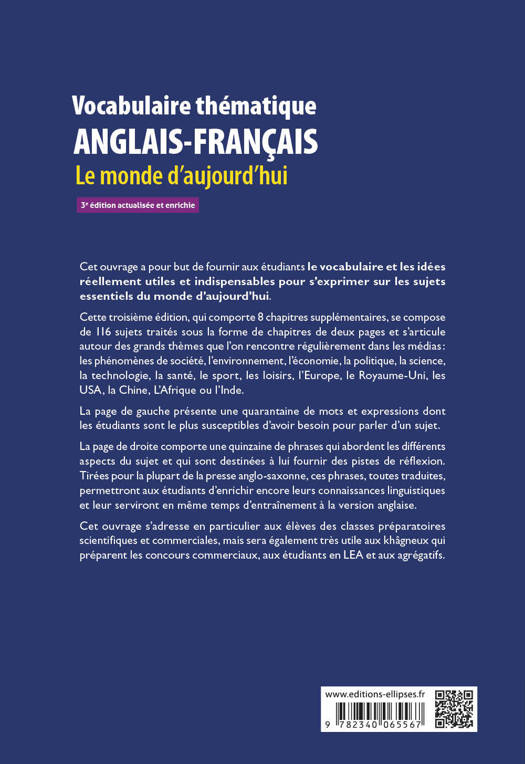 Cet ouvrage a pour but de fournir à l’étudiant levocabulaireet les idées réellement utiles et indispensables pour s’exprimer sur les sujets essentiels du monde d’aujourd’hui.