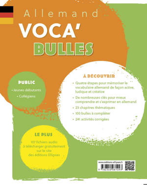 À destination des jeunes débutants ou des collégiens, ce cahier est idéal pour mémoriser son vocabulaire allemand autrement, en plusieurs étapes, de façon active, ludique et créative.