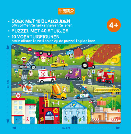 • 10 voertuigfiguren om in elkaar te zetten en op de puzzel te plaatsen
