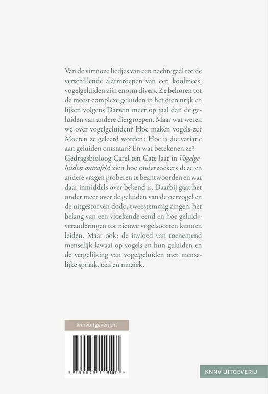 Gedragsbioloog Carel ten Cate laat in 'Vogelgeluiden ontrafeld' zien hoe onderzoekers deze en andere vragen proberen te beantwoorden en wat daar inmiddels over bekend is. Daarbij gaat het onder meer over de geluiden van de oervogel en de uitgestorven dodo, tweestemmig zingen, het belang van een vloekende eend en hoe geluidsveranderingen tot nieuwe vogelsoorten kunnen leiden. Maar ook: de invloed van toenemend menselijk lawaai op vogels en hun geluiden en de vergelijking van vogelgeluiden met menselijke spraak, taal en muziek.
