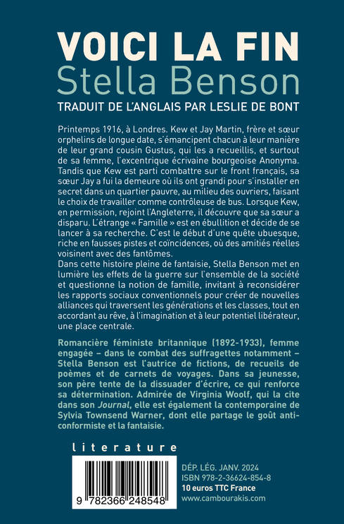 Printemps 1916, à Londres. Kew et Jay Martin, frère et soeur orphelins de longue date, s'émancipent chacun à leur manière de leur grand cousin Gustus, qui les a recueillis, et surtout de sa femme, l'excentrique écrivaine bourgeoise Anonyma. Tandis que Kew est parti combattre sur le front français, sa soeur Jay a fui la demeure où ils ont grandi pour s'installer en secret dans un quartier pauvre, au milieu des ouvriers, faisant le choix de travailler comme contrôleuse de bus. Lorsque Kew, en permission, rejoint l'Angleterre, il découvre que sa soeur a disparu. L'étrange « Famille » est en ébullition et décide de se lancer à sa recherche. C'est le début d'une quête ubuesque, riche en fausses pistes et coïncidences, où des amitiés réelles voisinent avec des fantômes. Dans cette histoire pleine de fantaisie, Stella Benson met en lumière les effets de la guerre sur l'ensemble de la société et questionne la notion de famille, invitant à reconsidérer les rapports sociaux conventionnels pour créer de nouvelles alliances qui traversent les générations et les classes, tout en accordant au rêve, à l'imagination et à leur potentiel libérateur, une place centrale.