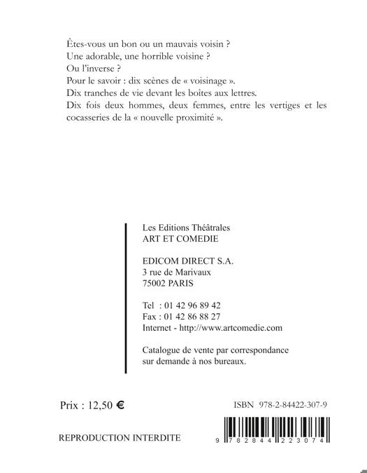 Êtes-vous un bon ou un mauvais voisin ? Une adorable, une horrible voisine ? Ou l'inverse ? Pour le savoir: dix scènes de voisinage . Dix tranches de vie devant les boîtes aux lettres. Dix fois deux hommes, deux femmes, entre les vertiges et les cocasseries de la nouvelle proximité .
