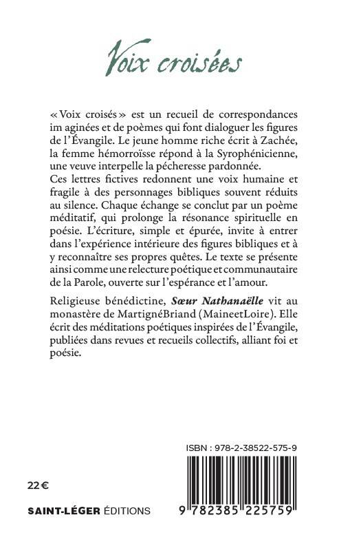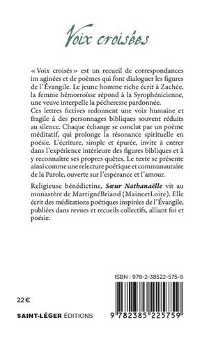 Voix croisées est un recueil de correspondances imaginées et de poèmes qui font dialoguer les figures de l’Évangile. Le jeune homme riche écrit à Zachée, la femme hémorroïsse répond à la Syrophénicienne, une veuve interpelle la pécheresse pardonnée. Ces lettres fictives redonnent une voix humaine et fragile à des personnages bibliques souvent réduits au silence. Chaque échange se conclut par un poème méditatif, qui prolonge la résonance spirituelle en poésie. L’écriture, simple et épurée, invite à entrer dans l’expérience intérieure des figures bibliques et à y reconnaître ses propres quêtes. Le texte se présente ainsi comme une relecture poétique et communautaire de la Parole, ouverte sur l’espérance et l’amour.
