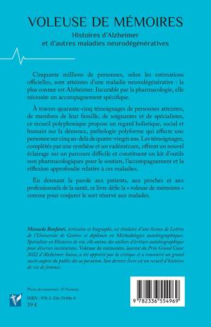 Cinquante millions de personnes, selon les estimations officielles, sont atteintes d'une maladie neurodégénérative: la plus connue est Alzheimer. Incurable par la pharmacologie, elle nécessite un accompagnement spécifique. À travers quarante-cinq témoignages de personnes atteintes, de membres de leur famille, de soignantes et de spécialistes, ce recueil polyphonique propose un regard holistique, social et humain sur la démence, pathologie polyforme qui affecte une personne sur cinq au-delà de quatre-vingts ans. Les témoignages, complétés par une synthèse et un vadémécum, offrent un nouvel éclairage sur un parcours difficile et constituent un kit d'outils non pharmacologiques pour le soutien, l'accompagnement et la réflexion approfondie relative à ces maladies. En donnant la parole aux patients, aux proches et aux professionnels de la santé, ce livre défie la voleuse de mémoires comme pour conjurer le sort réservé aux malades.