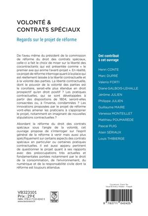 Abordant le projet de réforme du droit des contrats spéciaux sous l'angle de la volonté, ce colloque propose de s'interroger sur l'esprit général de la réforme à venir mais aussi plus spécifiquement sur certains aspects des contrats spéciaux en particulier ou certaines pratiques contractuelles. Le colloque se propose, entre outre, d'embrasser largement le droit des contrats en interrogeant la codification mise à l'oeuvre et son articulation avec celle qui a eu lieu en 2016. Il est aussi apparu pertinent de questionner le projet quant à ses rapports avec des préoccupations très actuelles et fondamentales portées notamment par le droit de la consommation, de l'environnement, du numérique et de la responsabilité civile dont la réforme est toujours attendue.