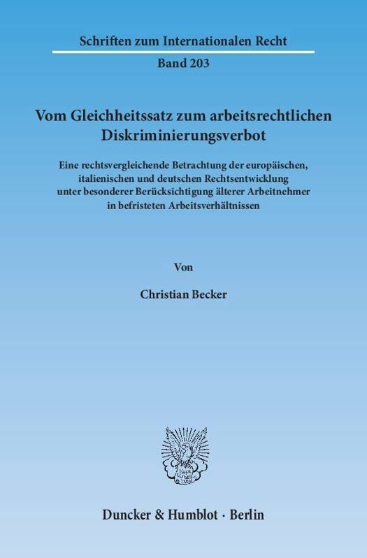 Christian Becker erörtert die geschichtliche Entwicklung des Gleichheitsbegriffs und diskutiert die modernen Vorschriften des Antidiskriminierungsrechts. Kern der Arbeit ist der Rechtsvergleich der Länder Deutschland und Italien. Gemeinsamkeiten und Unterschiede der Rechtssetzung und Rechtspraxis im Bereich der Antidiskriminierung werden untersucht, Stärken und Schwächen der jeweiligen Rechtsordnung analysiert und konkrete Änderungsvorschläge herausgearbeitet.
