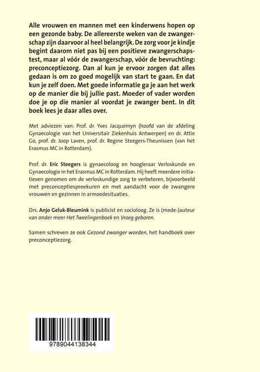 Alle vrouwen en mannen met een kinderwens hopen op een gezonde baby. De allereerste weken van de zwangerschap zijn daarvoor al heel belangrijk. De zorg voor je kindje begint daarom niet pas bij een positieve zwangerschapstest, maar al vóór de zwangerschap, vóór de bevruchting: preconceptiezorg. Dan al kun je ervoor zorgen dat alles gedaan is om zo goed mogelijk van start te gaan. En dat kun je zelf doen. Met goede informatie ga je aan het werk op de manier die bij jullie past. Moeder of vader worden doe je op die manier al voordat je zwanger bent. In dit boek lees je daar alles over.
