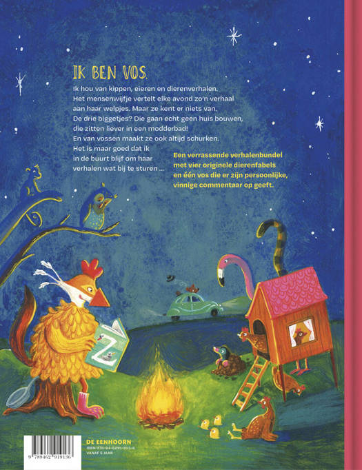 Vos luistert elke avond bij het raam naar de dierenverhalen die het mensenwijfje voorleest aan haar welpjes. Al heeft hij altijd wel zijn mening over de verhalen. Zo vindt hij de uil, die zich laat foppen door een mol, helemaal niet ‘wijs’. Want welk dier slaat er nu een praatje met zijn middageten? Ook tijger, uit de hilarische hervertelling van een Afrikaans volksverhaal, had beter moeten weten. Het verhaal over een beer die een nieuwe hoed ging kopen, vindt Vos al helemaal absurd. Beren dragen toch geen hoeden! En dan is er nog dat rare verhaal over die oude, roze flamingo die niet meer durft te dansen. Mmm ... Die kan dan vast ook niet meer zo snel wegrennen. Weet iemand toevallig waar die woont?
