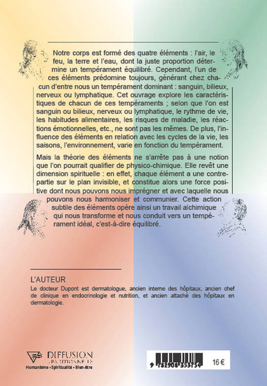 Notre corps est formé des quatre éléments : l’air, le feu, la terre et l’eau, dont la juste proportion détermine un tempérament équilibré. Cependant, l’un de ces éléments prédomine toujours, générant chez chacun d’entre nous un tempérament dominant : sanguin, bilieux, nerveux ou lymphatique. Le docteur Paul Dupont explore les caractéristiques de chacun de ces tempéraments ; selon que l’on est sanguin ou bilieux, nerveux ou lymphatique, le rythme de vie, les habitudes alimentaires, les risques de maladie, les réactions émotionnelles, etc., ne sont pas les mêmes. De plus, l’influence des éléments en relation avec les cycles de la vie, les saisons, l’environnement, varie en fonction du tempérament. Mais la théorie des éléments ne s’arrête pas à une notion que l’on pourrait qualifier de physico-chimique. Elle revêt une dimension spirituelle : en effet, chaque élément a une contrepartie sur le plan invisible, et constitue alors une force positive dont nous pouvons nous imprégner et avec laquelle nous pouvons nous harmoniser et communier. Cette action subtile des éléments opère ainsi un travail alchimique qui nous transforme et nous conduit vers un tempérament idéal, c’est-à-dire équilibré.