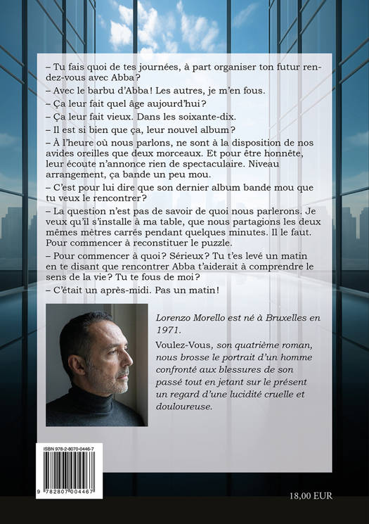 "– Tu fais quoi de tes journées, à part organiser ton futur rendez-vous avec Abbaâ?<br /> – Avec le barbu d’Abbaâ! Les autres, je m’en fous.<br /> – Ça leur fait quel âge aujourd’huiâ?<br /> – Ça leur fait vieux. Dans les soixante-dix.<br /> – Il est si bien que ça, leur nouvel albumâ? <br /> – À l’heure où nous parlons, ne sont à la disposition de nos avides oreilles que deux morceaux. Et pour être honnête, leur écoute n’annonce rien de spectaculaire. Niveau arrangement, ça bande un peu mou.<br /> – C’est pour lui dire que son dernier album bande mou que tu veux le rencontrerâ?<br /> – La question n’est pas de savoir de quoi nous parlerons. Je veux qu’il s’installe à ma table, que nous partagions les deux mêmes mètres carrés pendant quelques minutes. Il le faut. Pour commencer à reconstituer le puzzle.<br /> – Pour commencer à quoiâ? Sérieuxâ? Tu t’es levé un matin en te disant que rencontrer Abba t’aiderait à comprendre le sens de la vieâ? Tu te fous de moiâ?<br /> – C’était un après-midi. Pas un matinâ!"<br /> Laurent décide de revendre ses parts de la société qu’il a fondée avec son vieil ami Léopold. Motif avoué : la reformation du groupe Abba pour un enregistrement « qui bande mou » et un concert en hologramme. Mieux : il vendra à celui qui pourra lui arranger un rendez-vous avec Benny Anderson, le barbu du groupe. Nous suivons Laurent au jour le jour, dans ses relations avec son ex-associé, une amie de toujours qui parvient à le supporter, une prostituée de luxe, son chat Marcel, et surtout le souvenir de sa soeur cadette, fan d’Abba, fauchée par un chauffard le lendemain de la venue des Suédois à Bruxelles. Dans une lucidité désenchantée, le jeune retraité, en attendant son improbable rendez-vous, s’observe lucidement et amèrement au sein de notre monde qui tourne à vide dans les aberrations d’une débauche technologique mise au service de la médiocrité.<br />