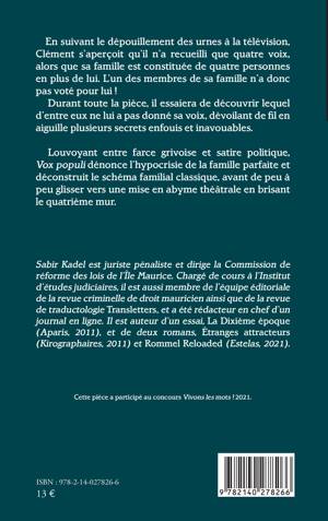 En suivant le dépouillement des urnes à la télévision, Clément s'aperçoit qu'il n'a recueilli que quatre voix, alors que sa famille est constituée de quatre personnes en plus de lui. L'un des membres de sa famille n'a donc pas voté pour lui ! Durant toute la pièce, il essaiera de découvrir lequel d'entre eux ne lui a pas donné sa voix, dévoilant de fil en aiguille plusieurs secrets enfouis et inavouables. Louvoyant entre farce grivoise et satire politique, Vox populi dénonce l'hypocrisie de la famille parfaite et déconstruit le schéma familial classique, avant de peu à peu glisser vers une mise en abyme théâtrale en brisant le quatrième mur.