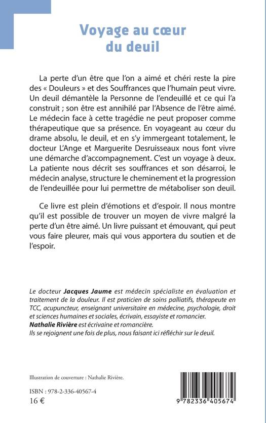 La perte d'un être que l'on a aimé et chéri reste la pire des « Douleurs » et des Souffrances que l'humain peut vivre. Un deuil démantèle la Personne de l'endeuillé et ce qui l'a construit ; son être est annihilé par l'Absence de l'être aimé. Le médecin face à cette tragédie ne peut proposer comme thérapeutique que sa présence. En voyageant au cur du drame absolu, le deuil, et en s'y immergeant totalement, le docteur L'Ange et Marguerite Desruisseaux nous font vivre une démarche d'accompagnement. C'est un voyage à deux. La patiente nous décrit ses souffrances et son désarroi, le médecin analyse, structure le cheminement et la progression de l'endeuillée pour lui permettre de métaboliser son deuil. Ce livre est plein d'émotions et d'espoir. Il nous montre qu'il est possible de trouver un moyen de vivre malgré la perte d'un être aimé. Un livre puissant et émouvant, qui peut vous faire pleurer, mais qui vous apportera du soutien et de l'espoir.