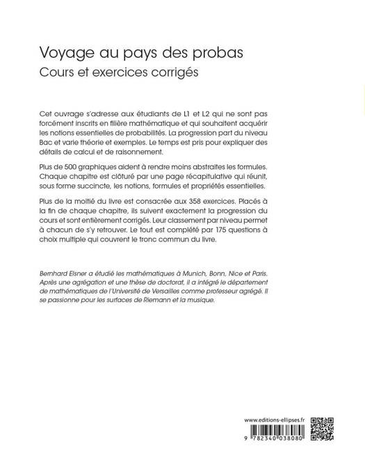 forcément inscrits en filière mathématique et qui souhaitent acquérir les notions essentielles de probabilités. La progression part du niveau bac et varie théorie et exemples, avec plus de 500 graphiques, des pages récapitulatives, 358 exercices corrigés et 175 questions à choix multiple.