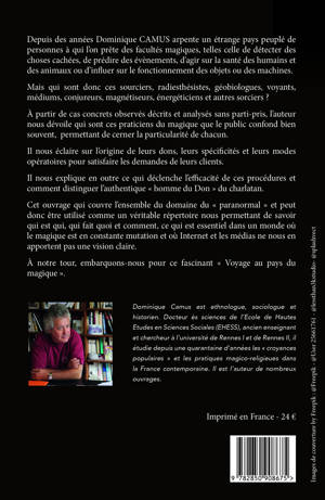 Dans ce livre, le fameux sociologue et ethnologue de la magie, Dominique Camus, nous invite à partir avec lui à la découverte des différents praticiens de l'étrange : sourciers, radiesthésistes, géobiologues, voyants, médiums, conjureurs, magnétiseurs, énergéticiens… C'est sur le terrain qu'il a enquêté pour lever le voile sur ces spécialistes de l'occultisme, dont l'influence et la présence sont moins marginales en France que ce que l'on pourrait croire. Grâce à des études de cas concrètes, cet ouvrage vous permettra de savoir comment chaque praticien de la magie perçoit et exécute son art et à quelles pratiques ou quelles spécificités se trouve l'origine de son don. À l'issue de ce voyage, vous aurez une vision claire de qui sont ces personnes aux talents paranormaux.