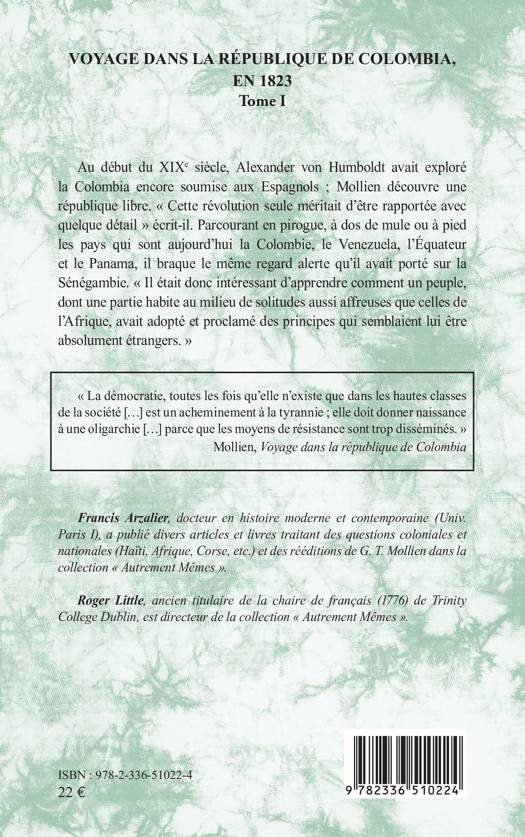 e siècle, Alexander von Humboldt avait exploré la Colombia encore soumise aux Espagnols; Mollien découvre une république libre. Cette révolution seule méritait d'être rapportée avec quelque détail écrit-il. Parcourant en pirogue, à dos de mule ou à pied les pays qui sont aujourd'hui la Colombie, le Venezuela, l'Équateur et le Panama, il braque le même regard alerte qu'il avait porté sur la Sénégambie. Il était donc intéressant d'apprendre comment un peuple, dont une partie habite au milieu de solitudes aussi affreuses que celles de l'Afrique, avait adopté et proclamé des principes qui semblaient lui être absolument étrangers.