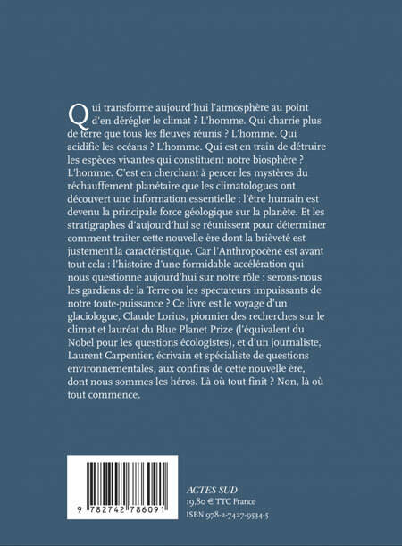 C'est en cherchant à percer les mystères du réchauffement planétaire que les climatologues ont découvert une information essentielle : l'humain est devenu la principale force géologique sur la planète. Et les stratigraphes d'aujourd'hui de se réunir pour déterminer comment traiter cette nouvelle ère dont la brièveté est justement la caractéristique. Car l'Anthropocène est avant tout cela : l'histoire d'une formidable accélération qui nous questionne aujourd'hui sur notre rôle : serons-nous les gardiens de la Terre ou les spectateurs impuissants de notre toute-puissance ? Ce livre est le voyage d'un climatologue, Claude Lorius, pionnier des recherches sur le climat et lauréat du Blue Planet Prize (l'équivalent du Nobel pour les questions écologistes), et d'un journaliste, Laurent Carpentier
