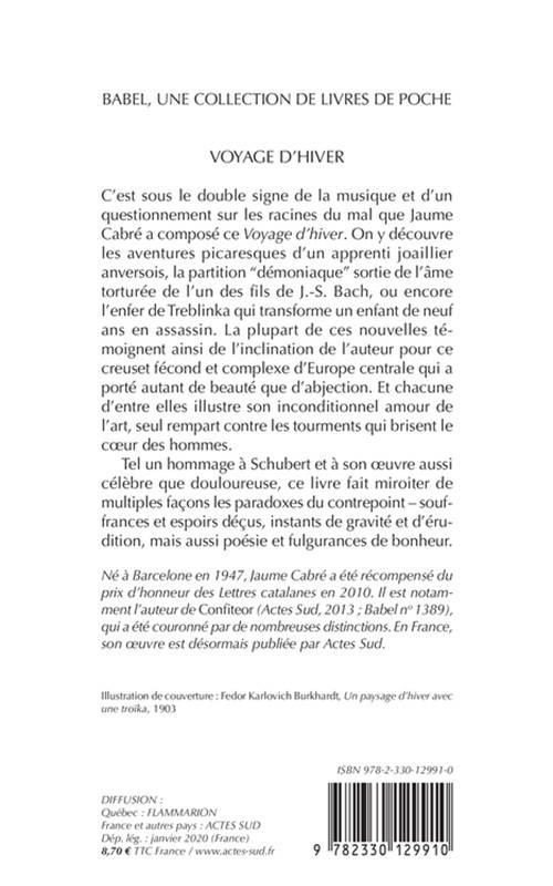 C'est sous le double signe de la musique et d'un questionnement sur les racines du mal que Jaume Cabré a composé ce «Voyage d'hiver». On y découvre les aventures picaresques d'un apprenti joaillier anversois, la partition "démoniaque" sortie de l'âme torturée de l'un des fils de J.-S. Bach, ou encore l'enfer de Treblinka qui transforme un enfant de neuf ans en assassin. La plupart de ces nouvelles témoignent ainsi de l'inclination de l'auteur pour ce creuset fécond et complexe d'Europe centrale qui a porté autant de beauté que d'abjection. Et chacune d'entre elles illustre son inconditionnel amour de l'art, seul rempart contre les tourments qui brisent le coeur des hommes.