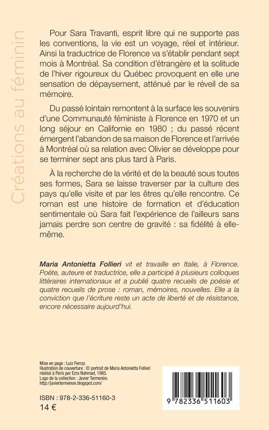 Pour Sara Travanti, esprit libre qui ne supporte pas les conventions, la vie est un voyage, réel et intérieur. Ainsi la traductrice de Florence va s'établir pendant sept mois à Montréal. Sa condition d'étrangère et la solitude de l'hiver rigoureux du Québec provoquent en elle une sensation de dépaysement, atténué par le réveil de sa mémoire. Du passé lointain remontent à la surface les souvenirs d'une Communauté féministe à Florence en 1970 et un long séjour en Californie en 1980; du passé récent émergent l'abandon de sa maison de Florence et l'arrivée à Montréal où sa relation avec Olivier se développe pour se terminer sept ans plus tard à Paris. À la recherche de la vérité et de la beauté sous toutes ses formes, Sara se laisse traverser par la culture des pays qu'elle visite et par les êtres qu'elle rencontre. Ce roman est une histoire de formation et d'éducation sentimentale où Sara fait l'expérience de l'ailleurs sans jamais perdre son centre de gravité sa fidélité à elle-même.