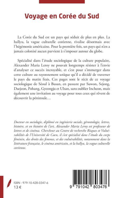 La Corée du Sud est un pays qui séduit de plus en plus. La hallyu, la vague culturelle coréenne, rivalise désormais avec l'hégémonie américaine. Pour la première fois, un pays qui n'en a jamais colonisé aucun parvient à s'imposer autour du globe. Spécialisé dans l'étude sociologique de la culture populaire, Alexander Maria Leroy ne pouvait longtemps résister à l'envie d'analyser ce succès incroyable, et c'est pour s'immerger dans cette culture au rayonnement unique qu'il a décidé de traverser le pays du matin frais. Ces pages sont le récit de ce voyage sociologique de Séoul à Busan, en passant par Suwon, Sejong, Daejeon, Pohang, Gyeongju et Ulsan, sans oublier Incheon, mais également une invitation au voyage pour tous ceux qui rêvent de découvrir la péninsule...