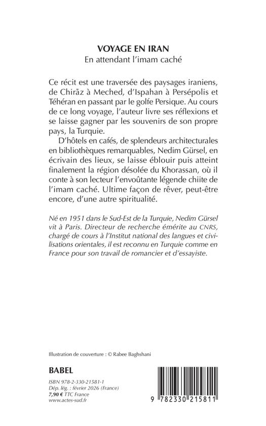Ce récit est une traversée des paysages iraniens, de Chiraz à Meched, d'Ispahan à Persépolis et Téhéran en passant par le golfe Persique. Au cours de ce long voyage, l'auteur livre ses réflexions et se laisse gagner par les souvenirs de son propre pays, la Turquie. D'hôtels en cafés, de splendeurs architecturales en bibliothèques remarquables, Nedim Gürsel, en écrivain des lieux, se laisse éblouir puis atteint finalement la région désolée du Khorassan, où il conte à son lecteur l'envoûtante légende chiite de l'imam caché. Ultime façon de rêver, peut-être encore, d'une autre spiritualité.