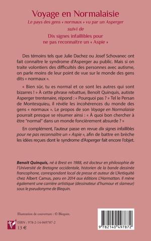 Des témoins tels que Julie Dachez ou Josef Schovanec ont fait connaître le syndrome d'Asperger au public. Mais si on traite volontiers des difficultés des personnes avec autisme, on parle moins de leur point de vue sur le monde des gens dits normaux . Bien sûr, tu es normal et ce sont les autres qui sont bizarres ! À cette phrase rebattue, Benoît Quinquis, autiste Asperger trentenaire, répond: Pourquoi pas ? Tel le Persan de Montesquieu, il révèle les incohérences du monde des gens normaux . Le propos de son Voyage en Normalaisie pourrait presque se résumer ainsi: À quoi bon chercher à être "normal" dans un monde foncièrement absurde ? En complément, l'auteur passe en revue dix signes infaillibles pour ne pas reconnaître un Aspie, afin de battre en brèche les idées reçues dont le syndrome d'Asperger fait encore l'objet.