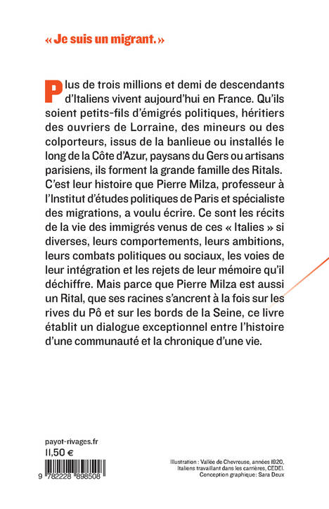 Plus de trois millions et demi de descendants d'Italiens vivent aujourd'hui en France. Qu'ils soient petits-fils d'émigrés politiques, héritiers des ouvriers de Lorraine, des mineurs ou des colporteurs, issus de la banlieue ou installés le long de la Côte d'Azur, paysans du Gers ou artisans parisiens, ils forment la grande famille des Ritals. C'est leur histoire que Pierre Milza, professeur à l'Institut d'études politiques de Paris et spécialiste des migrations, a voulu écrire. Ce sont les récits de la vie des immigrés venus de ces Italies si diverses, leurs comportements, leurs ambitions, leurs combats politiques ou sociaux, les voies de leur intégration et les rejets de leur mémoire qu'il déchiffre. Mais parce que Pierre Milza est aussi un Rital, que ses racines s'ancrent à la fois sur les rives du Pô et sur les bords de la Seine, ce livre établit un dialogue exceptionnel entre l'histoire d'une communauté et la chronique d'une vie.
