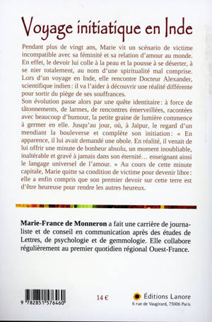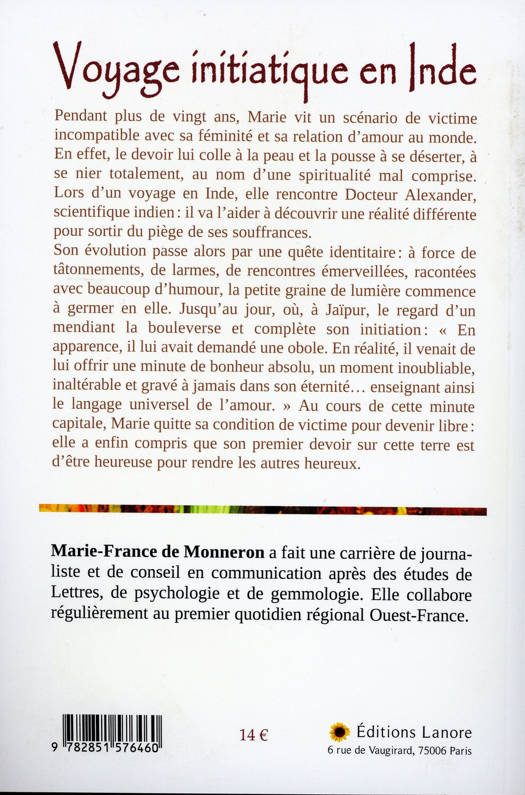 Pendant plus de vingt ans, Marie vit un scénario de victime incompatible avec sa féminité et sa relation d'amour au monde. En effet, le devoir lui colle à la peau et la pousse à se déserter, à se nier totalement, au nom d'une spiritualité mal comprise. Lors d'un voyage en Inde, elle rencontre Docteur Alexander, scientifique indien : il va l'aider à découvrir une réalité différente pour sortir du piège de ses souffrances. Son évolution passe alors par une quête identitaire : à force de tâtonnements, de larmes, de rencontres émerveillées, racontées avec beaucoup d'humour, la petite graine de lumière commence à germer en elle. Jusqu'au jour, où, à Jaïpur, le regard d'un mendiant la bouleverse et complète son initiation : « En apparence, il lui avait demandé une obole. En réalité, il venait de lui offrir une minute de bonheur absolu, un moment inoubliable, inaltérable et gravé à jamais dans son éternité... enseignant ainsi le langage universel de l'amour. » Au cours de cette minute capitale, Marie quitte sa condition de victime pour devenir libre : elle a enfin compris que son premier devoir sur cette terre est d'être heureuse pour rendre les autres heureux.