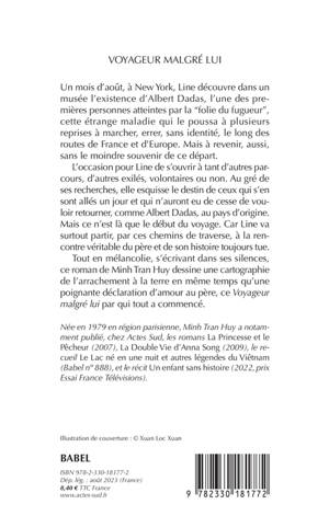 Un mois d'août, à New York, Line découvre dans un musée l'existence d'Albert Dadas, l'une des premières personnes atteintes par la "folie du fugueur", cette étrange maladie qui le poussa à plusieurs reprises à marcher, errer, sans identité, le long des routes de France et d'Europe. Mais à revenir, aussi, sans le moindre souvenir de ce départ. L'occasion pour Line de s'ouvrir à tant d'autres parcours, d'autres exilés, volontaires ou non. Au gré de ses recherches, elle esquisse le destin de ceux qui s'en sont allés un jour et qui n'auront eu de cesse de vouloir retourner, comme Albert Dadas, au pays d'origine. Mais ce n'est là que le début du voyage. Car Line va surtout partir, par ces chemins de traverse, à la rencontre véritable du père et de son histoire toujours tue. Tout en mélancolie, s'écrivant dans ses silences, ce roman de Minh Tran Huy dessine une cartographie de l'arrachement à la terre en même temps qu'une poignante déclaration d'amour au père, ce "Voyageur malgré lui" par qui tout a commencé.