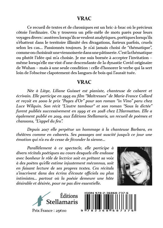 VRAC Ce recueil de textes et de chroniques est un bric-à-brac où le précieux côtoie l’ordinaire. On y trouvera un pêle-mêle de mots parés pour leurs voyages divers : austères lorsqu’ils se veulent analytiques, poétiques lorsqu’ils s’ébattent dans le territoire illimité des divagations, furieux parfois, cruels selon les cas... Passionnés toujours. Je n’ai jamais choisi de “thématique”, comme on choisirait une viennoiserie dans une pâtisserie. C’est la thématique ou plutôt l’idée qui m’a choisie. Je me suis bornée à accepter l’invitation – même lorsqu’elle me vint d’une descendante de la dynastie Covid originaire de Wuhan – mais à une seule condition : celle d’honorer le verbe qui la sert loin de l’obscène clapotement des langues de bois qui l’aurait tuée.