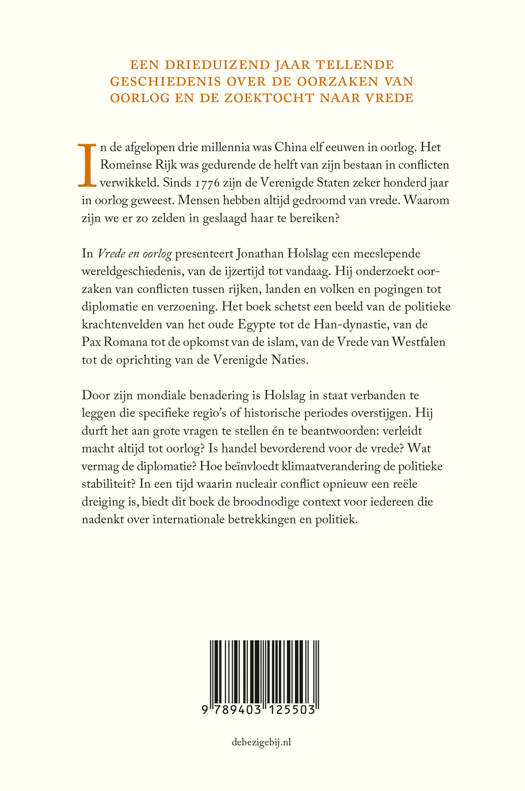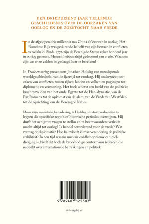 In Vrede en oorlog presenteert Jonathan Holslag een meeslepende wereldgeschiedenis, van de IJzertijd tot vandaag. Hij onderzoekt de oorzaken van conflicten tussen rijken, landen en volken en de pogingen tot diplomatie en verzoening. Het boek schetst een beeld van de politieke krachtenvelden van het oude Egypte tot de Han-dynastie, van de Pax Romana tot de opkomst van de islam, van de Vrede van Westfalen tot de oprichting van de Verenigde Naties.