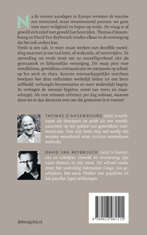 Na elke aanslag gaan we voor meer veiligheid – en hopen we op meer vrede. Maar is dat genoeg? Thomas d'Ansembourg en David Van Reybrouck vragen zich af of geweld zich echt enkel met geweld laat bestrijden. Vrede is een vak. De opvoeding tot vrede moet net zo vanzelfsprekend zijn als gymnastiek en lichamelijke verzorging. Dit essay pleit voor mindfulness, geweldloze communicatie en compassie op school, op het werk en thuis. Zweverig? Recente wetenschappelijke inzichten bewijzen hoe deze technieken werkelijk leiden tot een beter zelfbeeld, betere leerprestaties en wederzijds begrip. Ze verhogen de mentale hygiëne, zowel van mens als maatschappij. Als tien minuten stilzitten per dag volstaat, waarom doen we er dan decennia over om die gewoonte in te voeren?