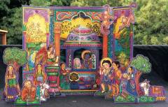 The exotic temple culture of India comes alive through this beautifully illustrated, die-cut model of a temple courtyard complete with altar and figures of Krishna, the cowherd boys and girls, cows and monkeys. Several prayers and songs provide a glimpse into the magical lives and daily worship of the inhabitants of the sacred city associated with Krishna. As an introduction to the culture of India for children three to thirteen, it has no peer. Includes: One Garuda Stambha, Ten play figures, Six village animal playmates, Seven paraphernalia items used in Hindu ceremonies, Tulsi Devi, Three songs, Three prayers and Four different activities. An introductory story and easy-to-follow instructions for performing puja included.