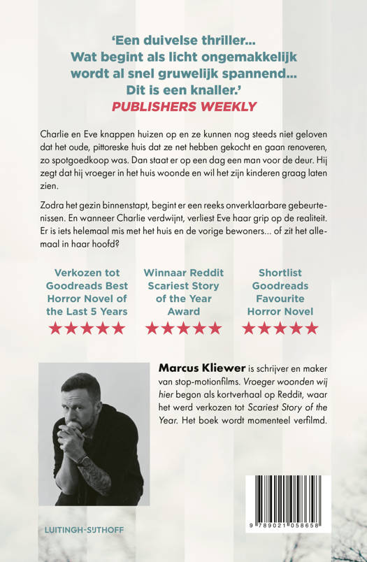 Vroeger woonden wij hier is het prijswinnende en huiveringwekkende debuut van Marcus Kliewer. Het boek is verkozen tot Reddit NoSleep Scariest Story of the Year en Goodreads Best Horror Novel of the Last 5 Years. Een verfilming op Netflix is in de maak.