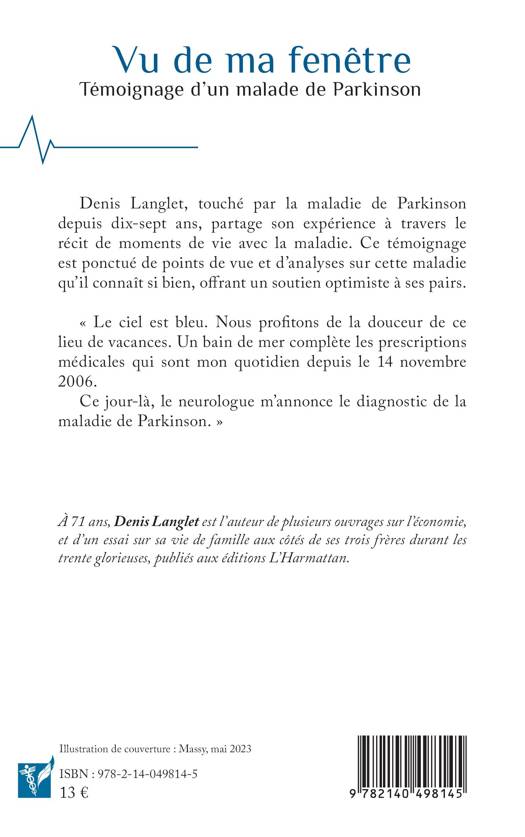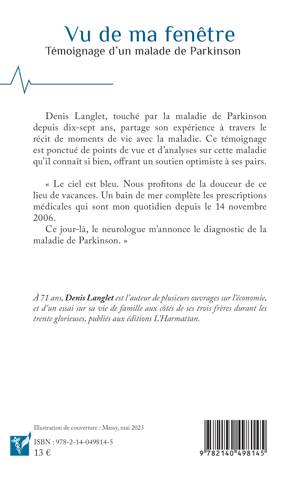 Denis Langlet, touché par la maladie de Parkinson depuis dix-sept ans, partage son expérience à travers le récit de moments de vie avec la maladie. Ce témoignage est ponctué de points de vue et d'analyses sur cette maladie qu'il connaît si bien, offrant un soutien optimiste à ses pairs. Le ciel est bleu. Nous profitons de la douceur de ce lieu de vacances. Un bain de mer complète les prescriptions médicales qui sont mon quotidien depuis le 14 novembre 2006. Ce jour-là, le neurologue m'annonce le diagnostic de la maladie de Parkinson.