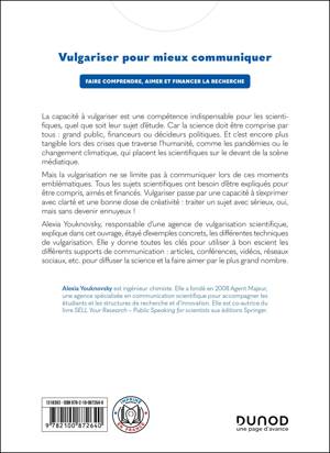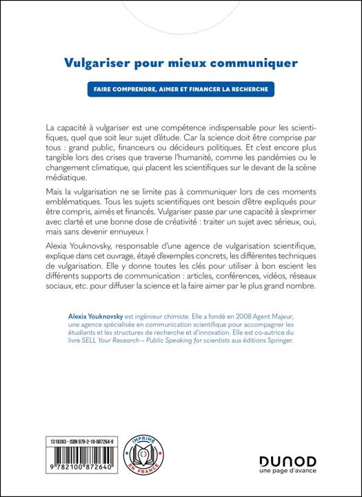 Alexia Youknovsky, responsable d’une agence de vulgarisation scientifique, explique dans cet ouvrage, étayé d’exemples concrets, les différentes techniques de vulgarisation. Elle y donne toutes les clés pour utiliser à bon escient les différents supports de communication : articles, conférences, vidéos, réseaux sociaux, etc. pour diffuser la science et la faire aimer par le plus grand nombre.