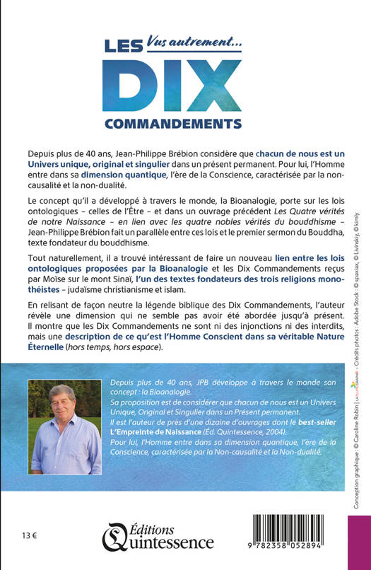 Jean-Philippe Brébion considère que chacun de nous est un Univers unique, original et singulier dans un présent permanent. Pour lui, l’Homme entre dans sa dimension quantique, l’ère de la Conscience, caractérisée par la non-causalité et la non-dualité. Le concept qu’il a développé, la Bioanalogie, porte sur les lois ontologiques – celles de l’Être – et dans un ouvrage précédent Les Quatre vérités de notre Naissance – en lien avec les quatre nobles vérités du bouddhisme – Jean-Philippe Brébion fait un parallèle entre ces lois et le premier sermon du Bouddha, texte fondateur du bouddhisme. Tout naturellement, il a trouvé intéressant de faire un nouveau lien entre les lois ontologiques proposées par la Bioanalogie et les Dix Commandements, l’un des textes fondateurs des trois religions monothéistes – judaïsme christianisme et islam. En relisant de façon neutre la légende biblique des Dix Commandements, l’auteur révèle une dimension qui ne semble pas avoir été abordée jusqu’à présent. Il montre que les Dix Commandements ne sont ni des injonctions ni des interdits, mais une description de ce qu’est l’Homme Conscient dans sa véritable Nature Éternelle (hors temps, hors espace).
