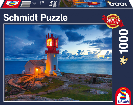 Puzzel van een sprookjesachtige verlichte vuurtoren in de schemering met een prachtige wolkenlucht op de achtergrond. Puzzel bevat 1000 stukjes leeftijd vanaf 12 jaar.