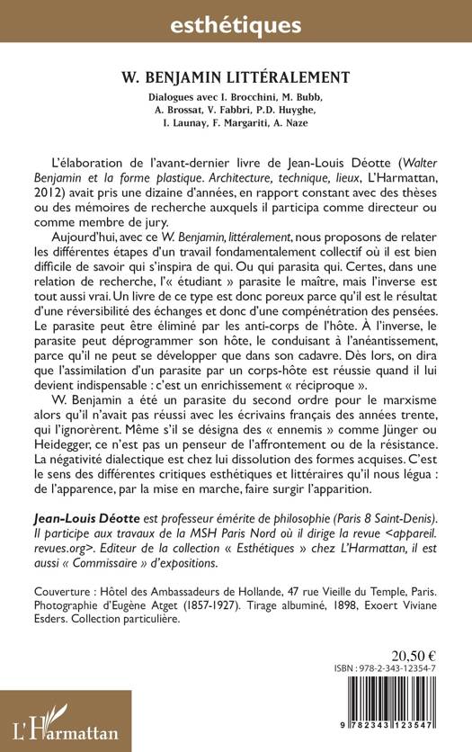 Ce n'est pas faire injure de penser que W.Benjamin, comme tout écrivain sans grande fortune, fut un parasite. Mais selon les trois modes possibles du parasitisme : soit il est rejeté par le corps-hôte (ce qui lui arriva avec le monde des Lettres français, avec quelques exceptions), soit il s'introduit si bien dans le corps-hôte qu'il y prospère et l'évince (le marxisme), soit il ne fait plus qu'un avec lui, par osmose ou compénétration. Ce qui est resté un idéal urbain pour lui.
