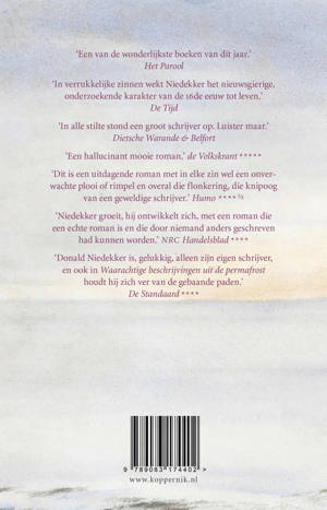 In zijn barokke stijl maakt Donald Niedekker van de legendarische overwintering een wonderwereld waarin fictie, geschiedenis, sprookjes en actualiteit vervlochten zijn tot een betoverend geheel.