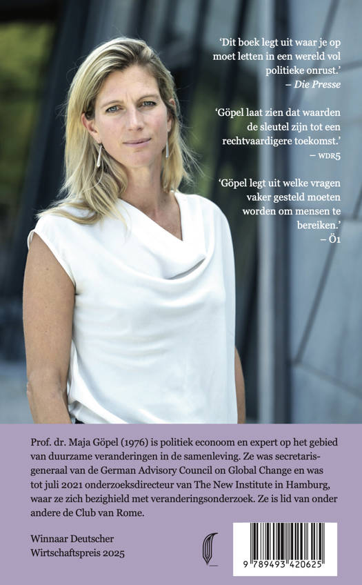 Hoe bied je de crisissen van deze wereld het hoofd? Om die vraag te beantwoorden duikt Maja Göpel in de geschiedenis van onze waarden. Waar komen ze vandaan, en hoe hebben ze ons als burgers gevormd? Waaraan kennen we gewicht toe? Göpel identificeert drie pijlers: vrijheid, solidariteit en rechtvaardigheid. Alleen zijn we die waarden meer en meer op het 'ik' gaan betrekken, en minder en minder op het 'wij'. Om onze democratie te laten functioneren is het noodzakelijk om gezamenlijk op te trekken. Kunnen we de uitdagingen van de toekomst het hoofd bieden door de essentie van onze waarden opnieuw te onderzoeken?