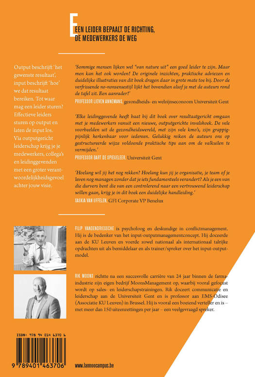 Een leider bepaalt de richting, de medewerkers de weg Output beschrijft 'het gewenste resultaat', input beschrijft 'hoe' we dat resultaat bereiken. Tot waar mag een leider sturen? Effectieve leiders sturen op output en laten de input los. Via outputgericht leiderschap krijg je je medewerkers, collega's en leidinggevenden met een groter verantwoordelijkheidsgevoel achter jouw visie.