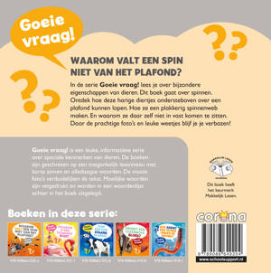 In de serie Goeie vraag! lees je over bijzondere eigenschappen van dieren. Dit boek gaat over spinnen. Ontdek hoe deze harige diertjes ondersteboven over een plafond kunnen lopen. Hoe ze een plakkerig spinnenweb maken. En waarom ze daar zelf niet in vast komen te zitten. Door de prachtige foto’s en leuke weetjes blijf je je verbazen!