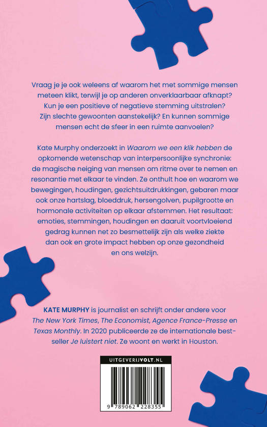 Kate Murphy, auteur van de internationale bestseller Je luistert niet, onderzoekt in Waarom we een klik hebben voor het eerst de opkomende wetenschap van interpersoonlijke synchronie: de schijnbaar magische neiging van mensen om elkaars ritme over te nemen en resonantie met elkaar te vinden. Ze onthult hoe en waarom we bewegingen, houdingen, gezichtsuitdrukkingen, gebaren maar ook hartslag, bloeddruk, hersengolven, pupilgrootte en hormonale activiteiten op elkaar afstemmen. Het resultaat: emoties, stemmingen, houdingen en daaruit voortvloeiend gedrag kunnen net zo besmettelijk zijn als welke ziekte dan ook en grote impact hebben op onze gezondheid en welzijn.