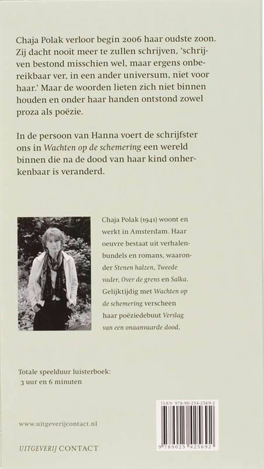 Chaja Polak verloor begin 2006 haar oudste zoon. Zij dacht nooit meer te zullen schrijven, 'schrijven bestond misschien wel, maar ergens onbereikbaar ver, in een ander universum, niet voor haar.' Maar de woorden lieten zich niet binnen houden en onder haar handen ontstond zowel proza als poëzie. In de persoon van Hanna voert de schrijfster ons in 'Wachten op de schemering' een wereld binnen die na de dood van haar kind onherkenbaar is veranderd.
