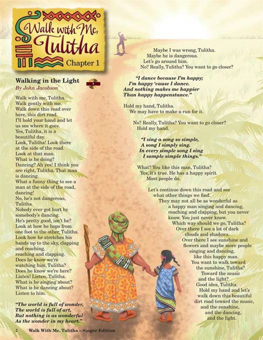 (Music Express Books). Join Tulitha on a wondrous adventure of discovery when she meets a wise, old woman who helps her see what is good in the world. Along the journey, they meet fascinating people and observe events that help mold Tulitha's young life and help her make choices about the roads to travel. This enchanting 30-minute musical story is ideal for classroom or stage and can be easily-produced for the teacher on the go! Suggested for grades 3-6, Tulitha's journey features 5 songs with connecting story text that can either be divided among a number of speakers or read by one narrator. Perform it in a concert setting on choral risers with minimal staging or use your imagination and stage it more elaborately. The Teacher Edition includes piano/vocal arrangements with choreography by John Jacobson, standards-based lesson plans and reproducible story text. The full-color singer editions with story and vocal parts provide extra visual appeal. The value-packed Classroom Kit comes complete with a Teacher book, 20 singer editions and a P/A CD. Available separately: Teacher Edition, Singer Edition 20-Pak (full color), Performance/Accompaniment CD, Classroom Kit (Teacher, Singer 20-Pak, P/A CD). Duration: ca. 30 minutes. Suggested for grades 3-6.