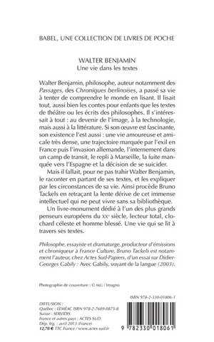 Son oeuvre est considérable dans bien des domaines, et fragmentaire. Sa vie aussi est fascinante. Bruno Tackels consacre un livre-monument à l'un des plus grands intellectuels européens du XXe siècle, lecteur total, clochard céleste, homme blessé : Walter Benjamin.