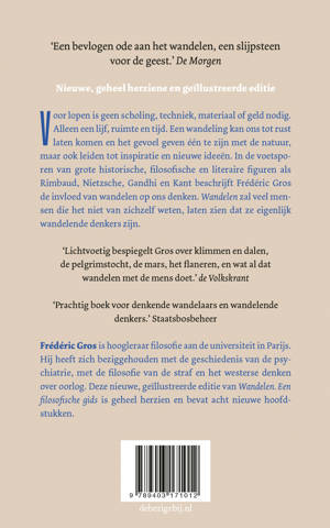 Tot rust komen, één worden met de natuur, voldoening: de zegeningen van het wandelen spreken steeds meer mensen aan. Voor lopen is geen scholing, techniek, materiaal of geld nodig. Alleen een lijf, ruimte en tijd. Wandelen wordt door Frédéric Gros nadrukkelijk beschreven als een filosofische daad en als een spirituele ervaring. Voor veel grote historische, filosofische of literaire figuren was lopen een manier om gedachten te ontwikkelen of inspiratie op te doen: Arthur Rimbaud, Friedrich Nietzsche, Mahatma Gandhi en Immanuel Kant. Ook existentiële, mystieke en culturele aspecten van het lopen komen in dit boek ter sprake: eeuwigheid, eenzaamheid, stilte, traagheid, vrijheid en de pelgrimstocht. Wandelen zal veel mensen die het niet van zichzelf weten, tonen dat ze eigenlijk wandelende denkers zijn.