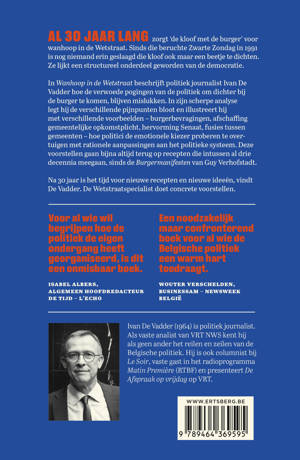 In Wanhoop in de Wetstraat beschrijft politiek journalist Ivan De Vadder hoe de verwoede pogingen van de politiek om dichter bij de burger te komen, steeds stuklopen. Na 30 jaar is het tijd voor nieuwe recepten en nieuwe ideeën. De Wetstraatspecialist doet concrete voorstellen.