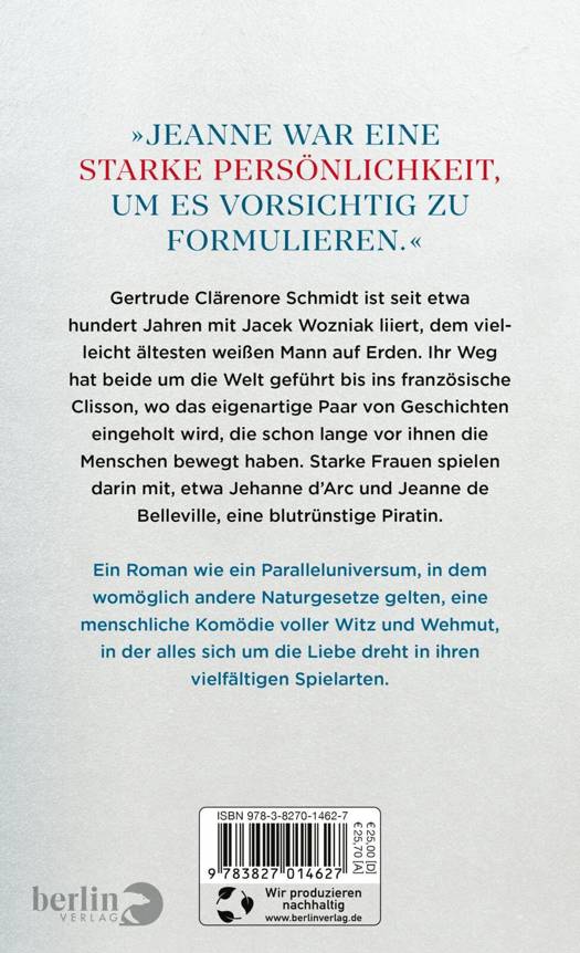'Jeanne war eine starke Persönlichkeit, um es vorsichtig zu formulieren.'Gertrude Clärenore Schmidt ist seit etwa hundert Jahren mit Jacek Wozniak liiert, dem vielleicht ältesten weißen Mann auf Erden. Ihr Weg hat beide um die Welt geführt bis ins französische Clisson, wo das eigenartige Paar von Geschichten eingeholt wird, die schon lange vor ihnen die Menschen bewegt haben. Starke Frauen spielen darin mit, etwa Jehanne d'Arc und Jeanne de Belleville, eine blutrünstige Piratin. Ein Roman wie ein Paralleluniversum, in dem womöglich andere Naturgesetze gelten, eine menschliche Komödie voller Witz und Wehmut, ¿in der alles sich um die Liebe dreht in ihren vielfältigen Spielarten.